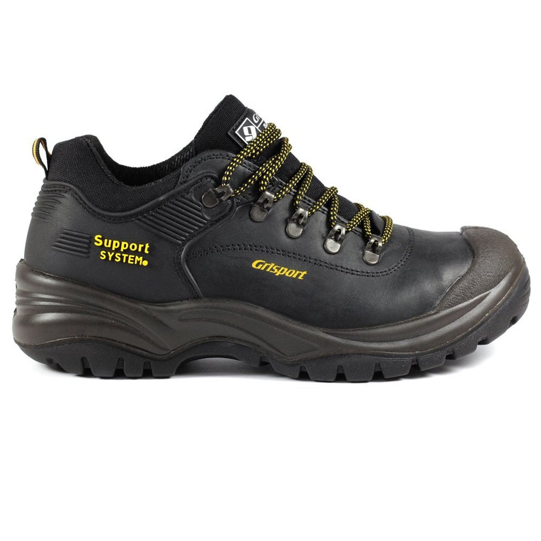 As the boot is fully S3 protected, it is therefore finished with a number of specific specification features including antistatic, external resistance to fuel oil of outside, energy absorption of the heel region and so on. This boot is also fully water resistant on the upper, as well as being penetration resistance thanks to its anti-perforation steel midsole. The shoe is extremely lightweight at only 147g, and with its FC flex composite is therefore very comfortable and wearable as a safety shoe. Aesthetically, this trainer style safety shoe is finished with a black leather and the vibrant yellow Grisport logo.